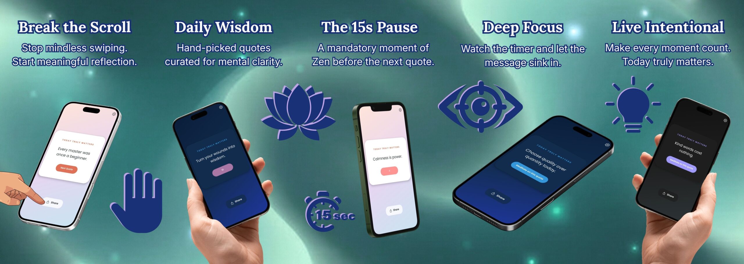Micro-meditations are proven to reduce stress and improve focus. By integrating a non-skippable 15-second reflection period, Today Truly Matters helps you move from passive consumption to active realization.